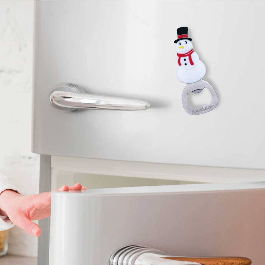 Espalha alegria natalícia com este abre-caricas boneco de neve com íman — um presente prático e divertido que junta utilidade e decoração num só artigo!