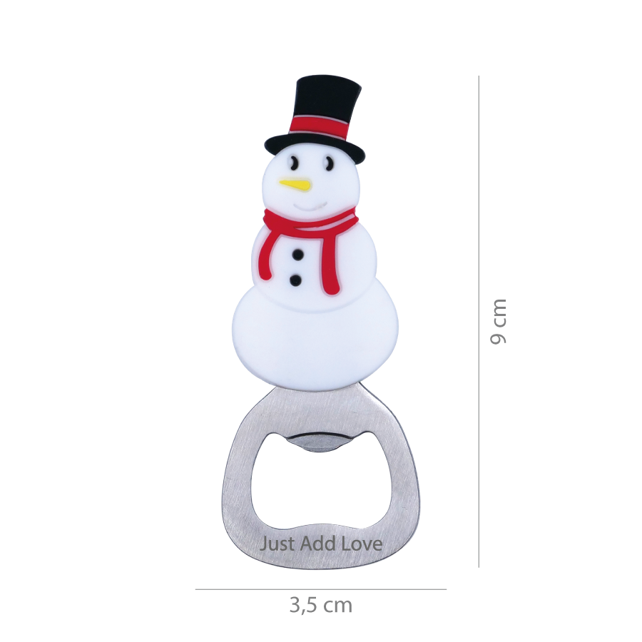 Este abre-caricas tem uma base metálica resistente e uma figura em relevo de boneco de neve com chapéu e cachecol, perfeita para entrar no espírito festivo. Inclui íman na parte de trás, para que fique sempre à mão no frigorífico — pronto para os brindes das festas!