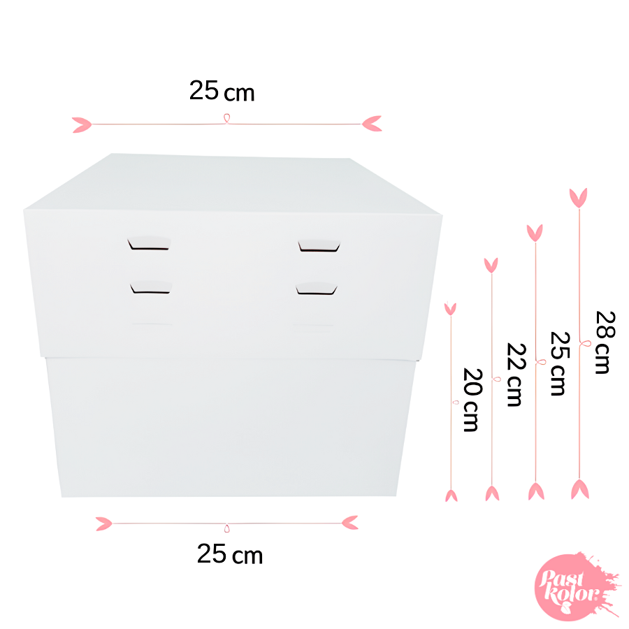 Caixa para bolos de 25×25 cm com 4 alturas moduláveis (20, 22, 25 e 28 cm). Fabricada em cartolina resistente, ideal para transporte e proteção das suas criações.