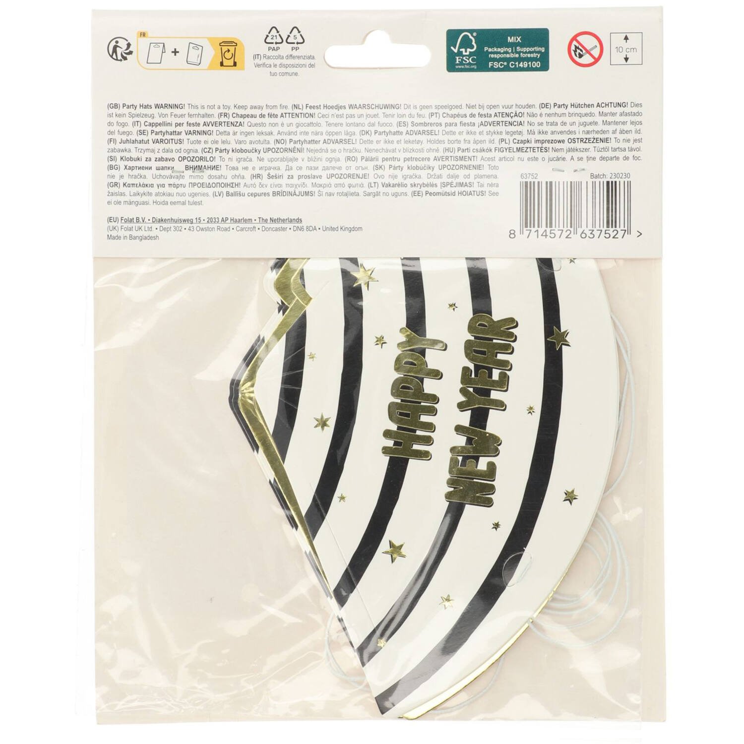 Os Chapéus de Festa Happy New Year Preto e Dourado são o acessório ideal para celebrar a passagem de ano com estilo, brilho e muita animação. Com um design moderno e festivo, combinam tons de preto, dourado e branco, com detalhes metalizados e a mensagem Happy New Year.