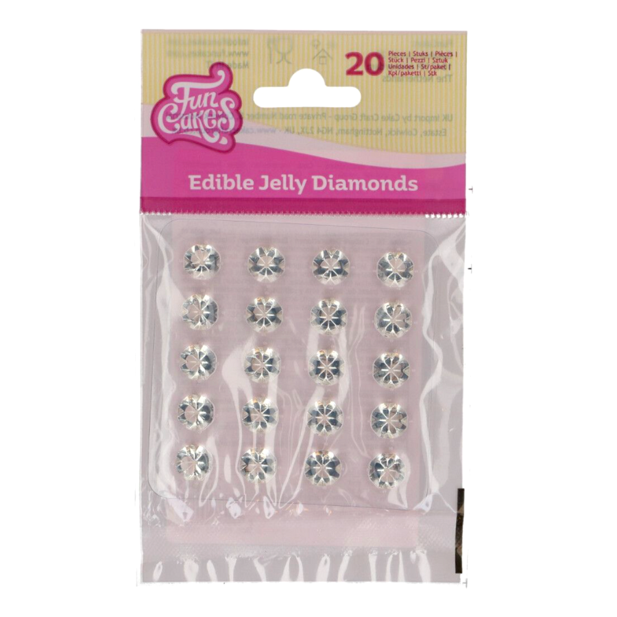Diamantes de gelatina comestíveis transparentes com aproximadamente 10mm. Ideais para decorar bolos, cupcakes e sobremesas. Embalagem com 20 unidades.