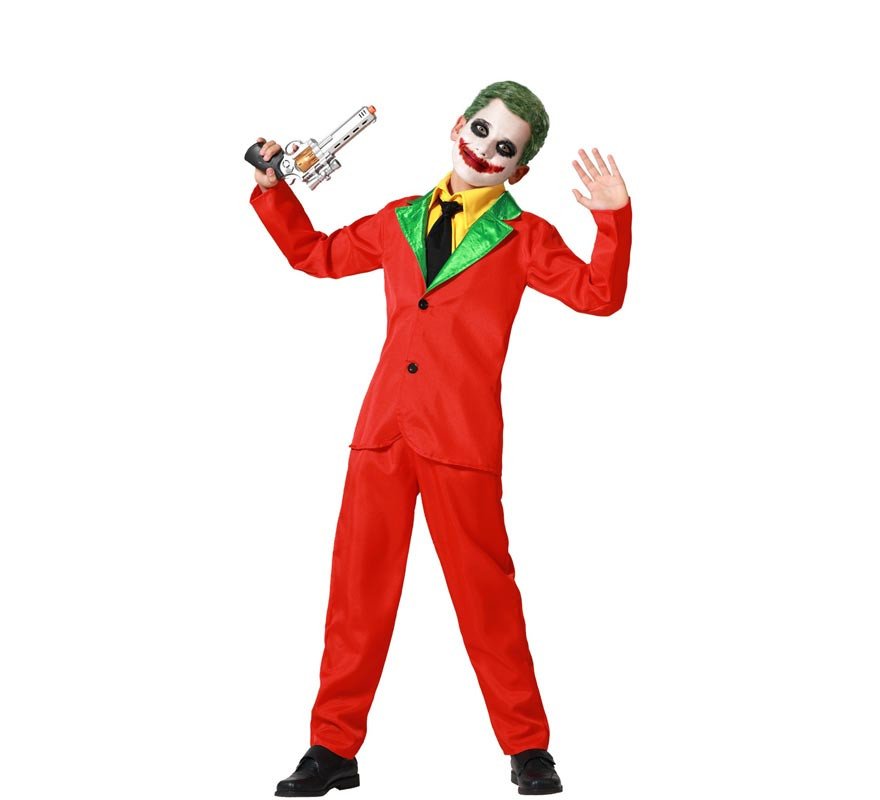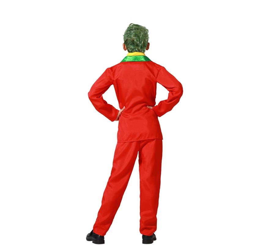 O conjunto inclui uma casaca vermelha com gola verde brilhante, uma falsa camisa amarela com gravata preta e calças a condizer, criando um visual completo e marcante.