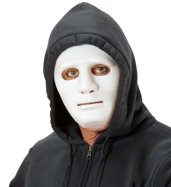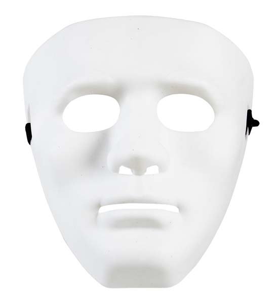 Máscara Anonymous branca em plástico, ideal para Carnaval, Halloween e festas temáticas. Um acessório icónico para disfarces adultos.
