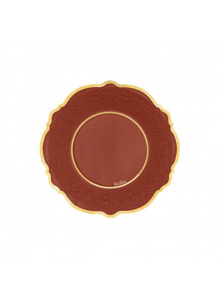 Pack com 8 pratos vermelhos de papel com borda dourada. Elegantes, recicláveis e ideais para festas, mesas natalícias ou eventos especiais.