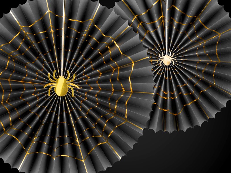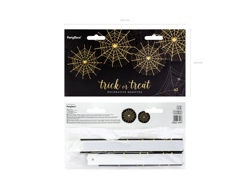 Este conjunto inclui 2 rosetas em papel de tons pretos com detalhes dourados, adornadas com pequenas aranhas metálicas — perfeitas para dar um toque misterioso e brilhante à sua decoração de Halloween.