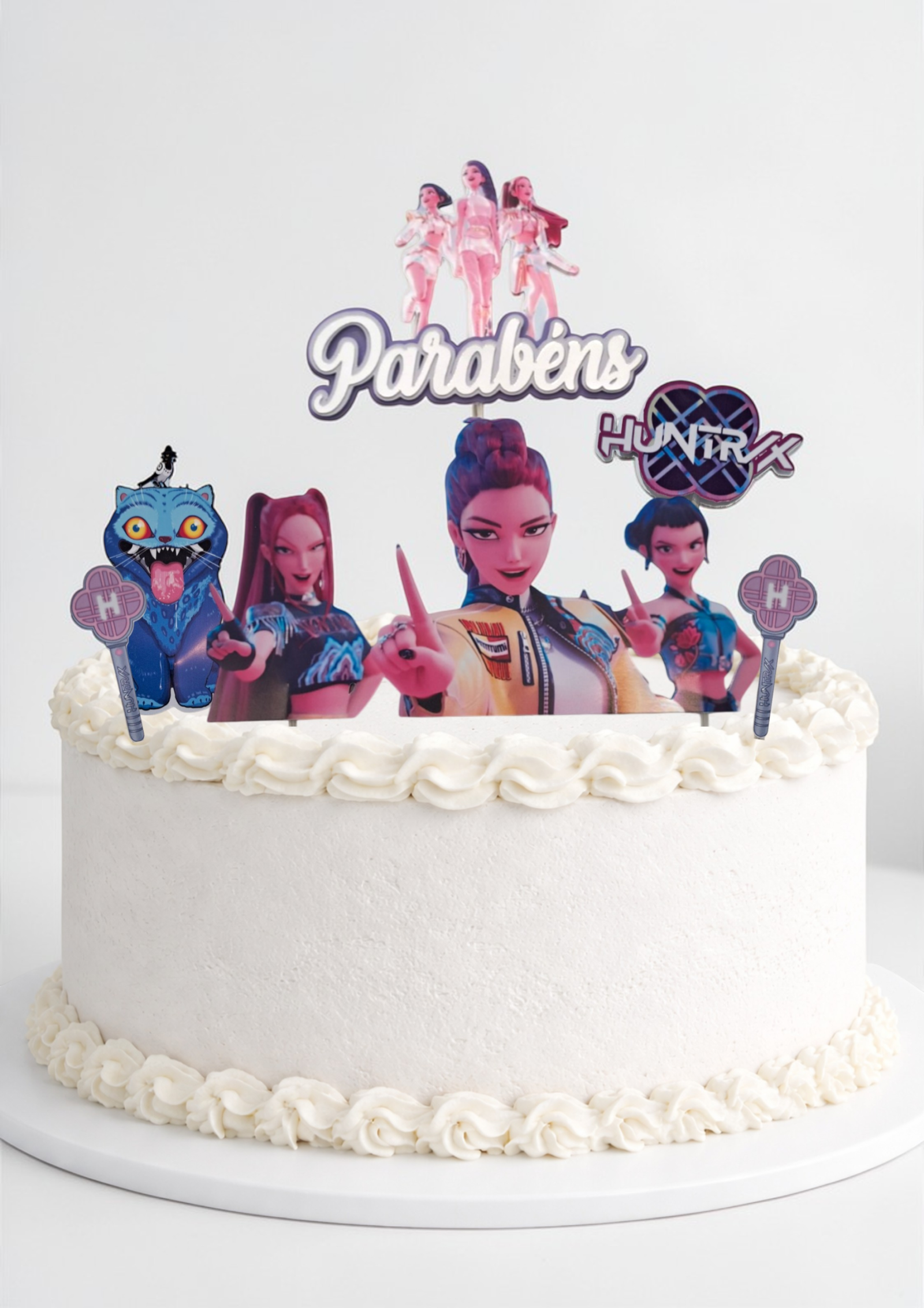 Este conjunto decorativo é ideal para festas de aniversário temáticas de K-pop, trazendo as personagens e elementos do universo Demon Hunters para o topo do bolo.