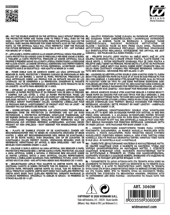O pack inclui 10 unhas falsas acompanhadas de adesivos de cola, garantindo fácil aplicação e boa fixação durante a festa.