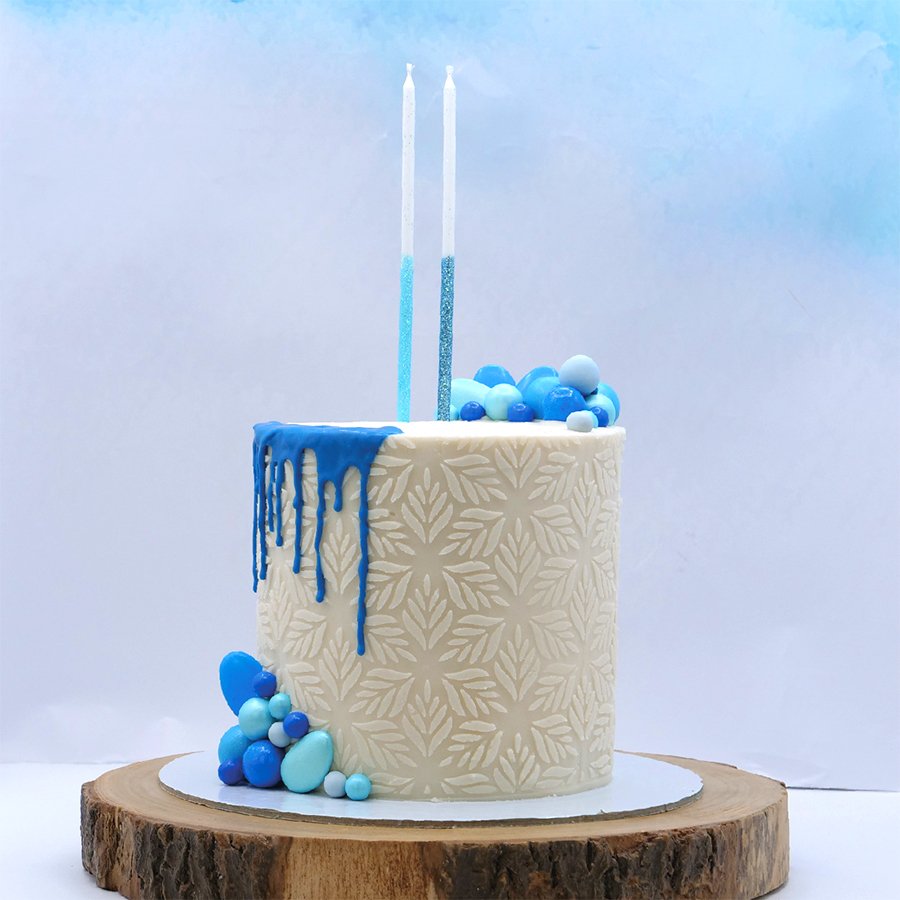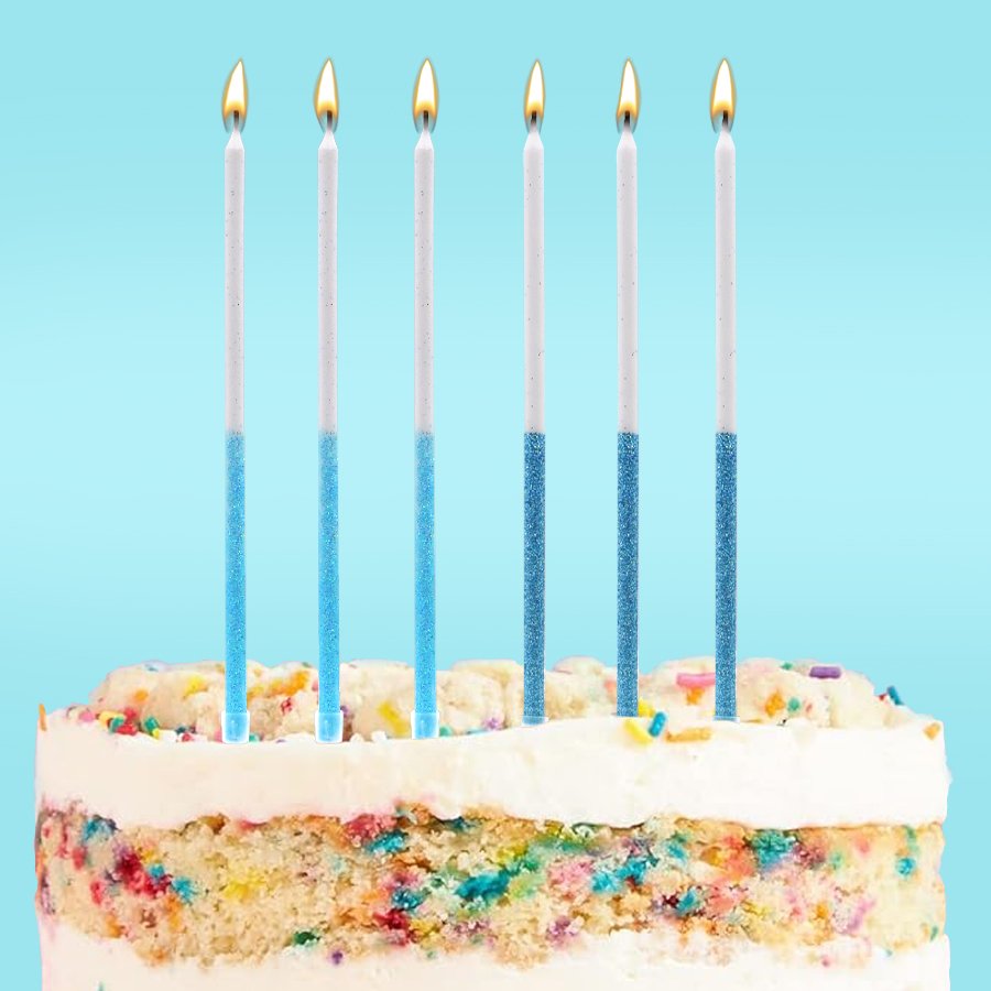 Estas velas altas com glitter em tons de azul e branco são o toque final perfeito para qualquer bolo de festa ✨